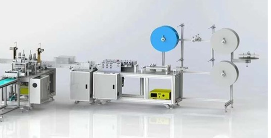 全自動平面口罩機是將一臺口罩本體機與一臺分流機相連接,再通過分流機和耳帶溶接機相連接,當機器啟動后口罩本體機生產出產品后由傳輸帶輸送到分流機上,再由分流機傳送口罩。耳帶熔接機進行耳帶部分的熔接以完成一個完整的口罩成品,整個過程全部自動化生產,不需要人工操作,產量可達110~120/分鐘。