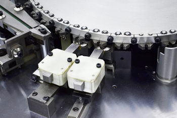 被測試元件通過振動盤振動送料,進入無振動直線送料系統,經入料夾傳送至分割器圓盤夾,在測試工位經過測試後,再由圓盤夾傳送至相應的落料口,電磁閥驅動氣缸開夾落料,被測試元件經落料管道進入指定的分料箱,不良品落入廢料箱。